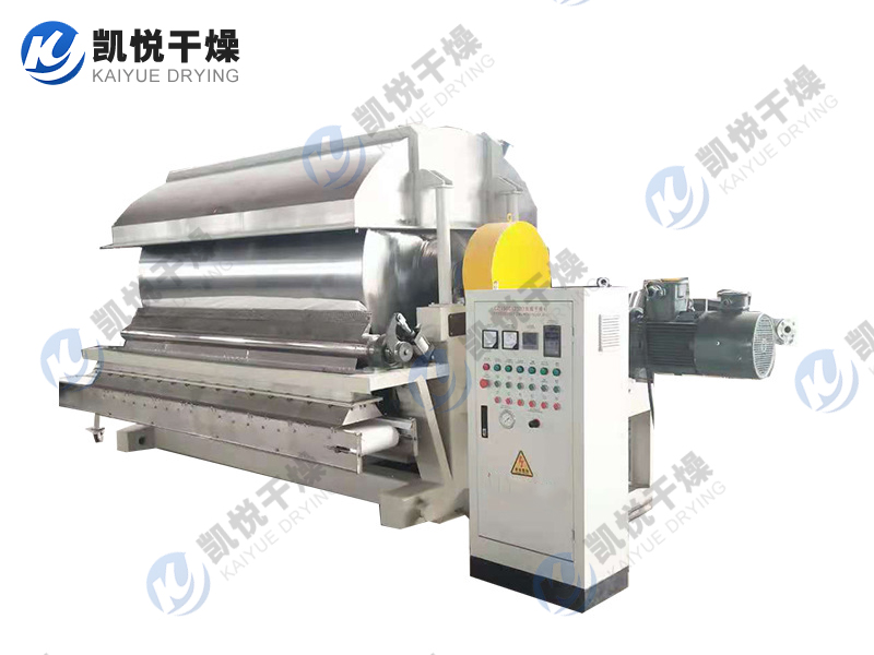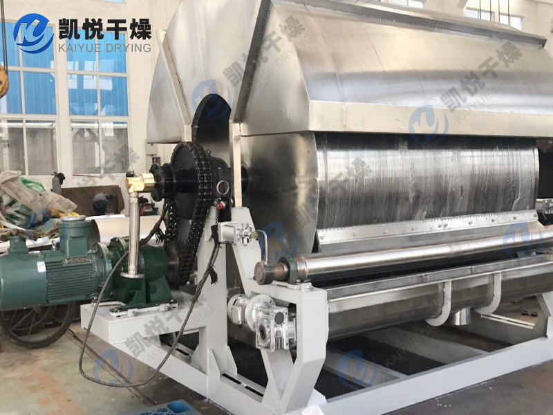 液体或泥浆状物料在水蒸汽或其它热载体加热的滚筒表面形成薄膜,并在滚筒转一圈的过程中便被干燥完毕,利用刮刀把产品刮下来,露出滚筒表面再次与原料接触形成薄膜进行干燥。