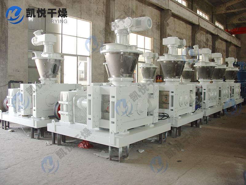 粉状物料由振动给料斗经横向螺旋送料器定量,均匀地加人轧片主料斗,使轧片主料斗内保持恒定的料粒,然后由轧片主料内的纵向锥螺旋对粉料进行预压缩并输送到两只压辊的弧形槽口,两只压辊表面均匀分布形状相同的半扁圆形弧槽或菱形槽,通过一对齿轮的啮合传动,使两只压辊等速,反向旋转,将锥螺旋输送至槽口的物料咬入槽内并瞬间强制压缩,物料经过压缩后随着压力逐渐减小在其弹力及重力作用下,从槽内脱落,进入破碎整粒系统,然后根据用户的粒度要求过筛、分级,得到符合质量要求的均匀颗粒状产品,筛下粉重新返回振动料斗循环利用。